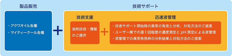 技術サポートには油剤技術・情報のご提供と迅速液管理が含まれます。